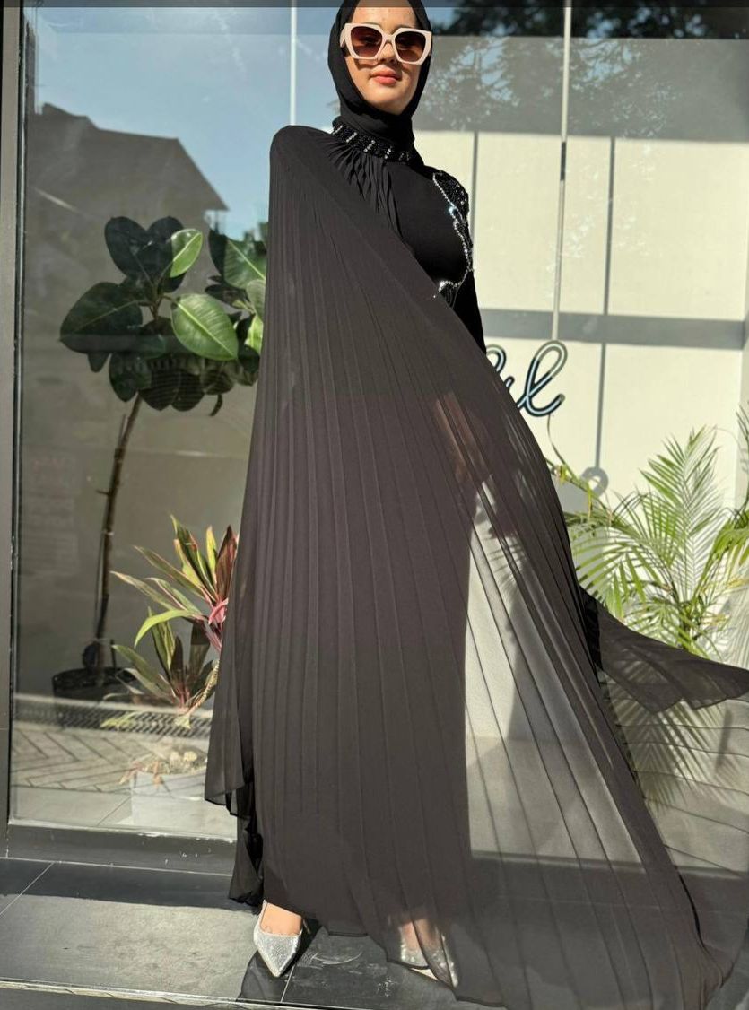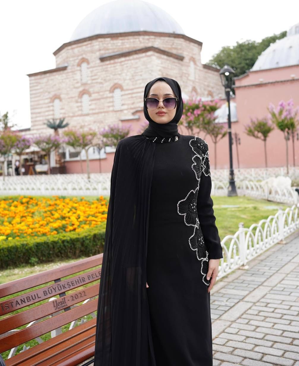 Style: Evening elegant dress with chiffon veil on the shoulder and handmade emroidered flowers on the side
