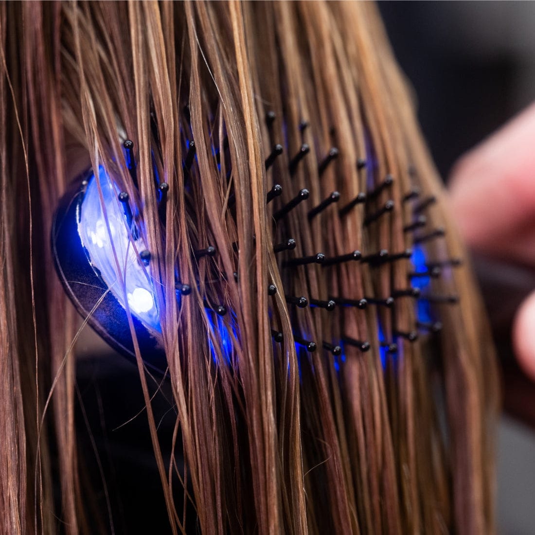 The treatment takes less than 10 minutes, spray the treatment into freshly washed and towel-dried hair, then brush through with our BioLAP-20 brush and its custom light. Thousands of biological light-activated BioLAP-20 molecules rebuild and repair your hair again. The brush is designed to withstand hundreds of treatments.